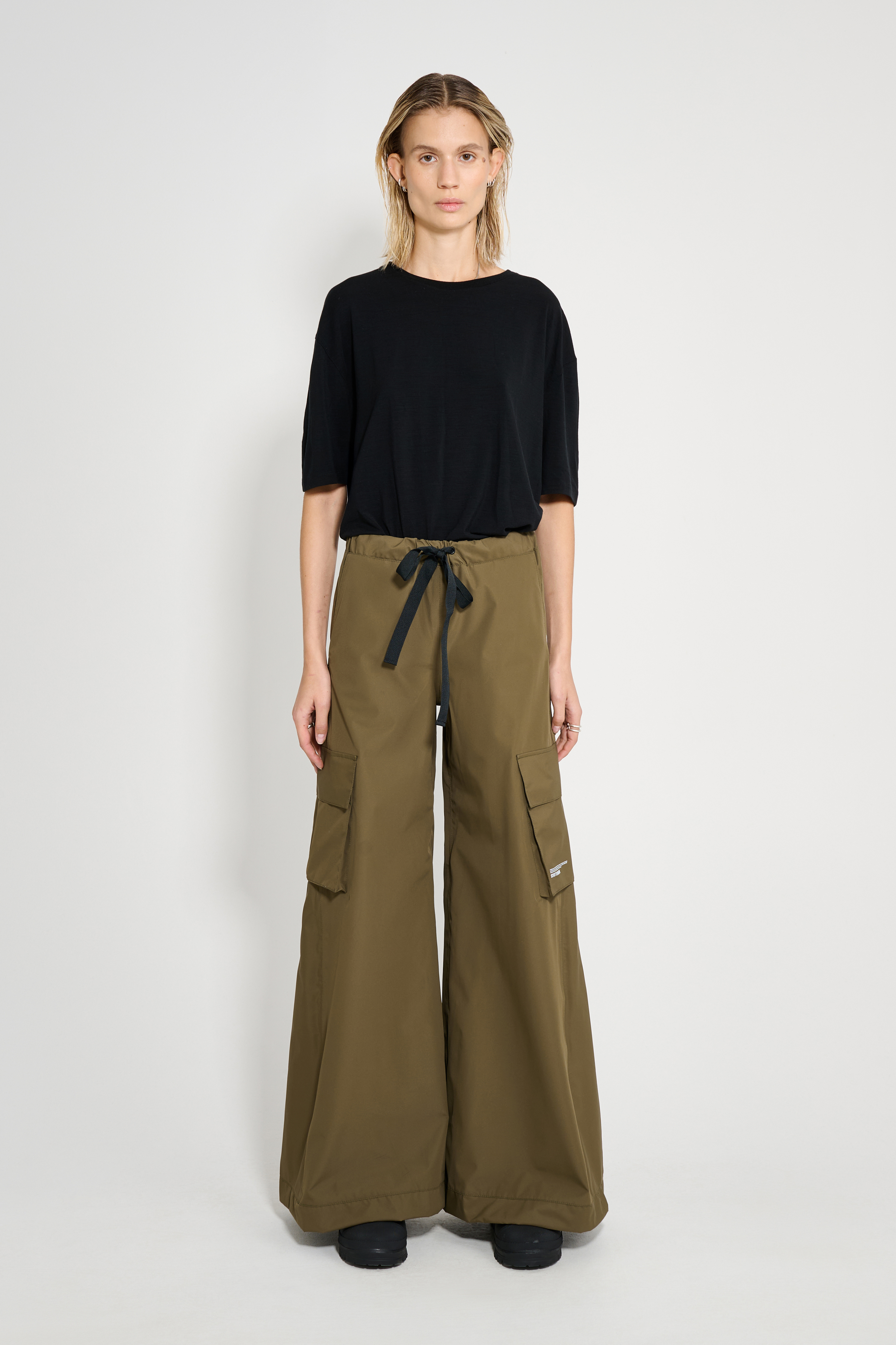 Karla Pocket Lightweight are flared trousers for women in a light and breathable nylon fabric. These high-waist trousers have taped inside seams, making them resistant to wind and rain. The wide legs are decorated with large patch pockets on each thigh, offering both functionality and a style statement.