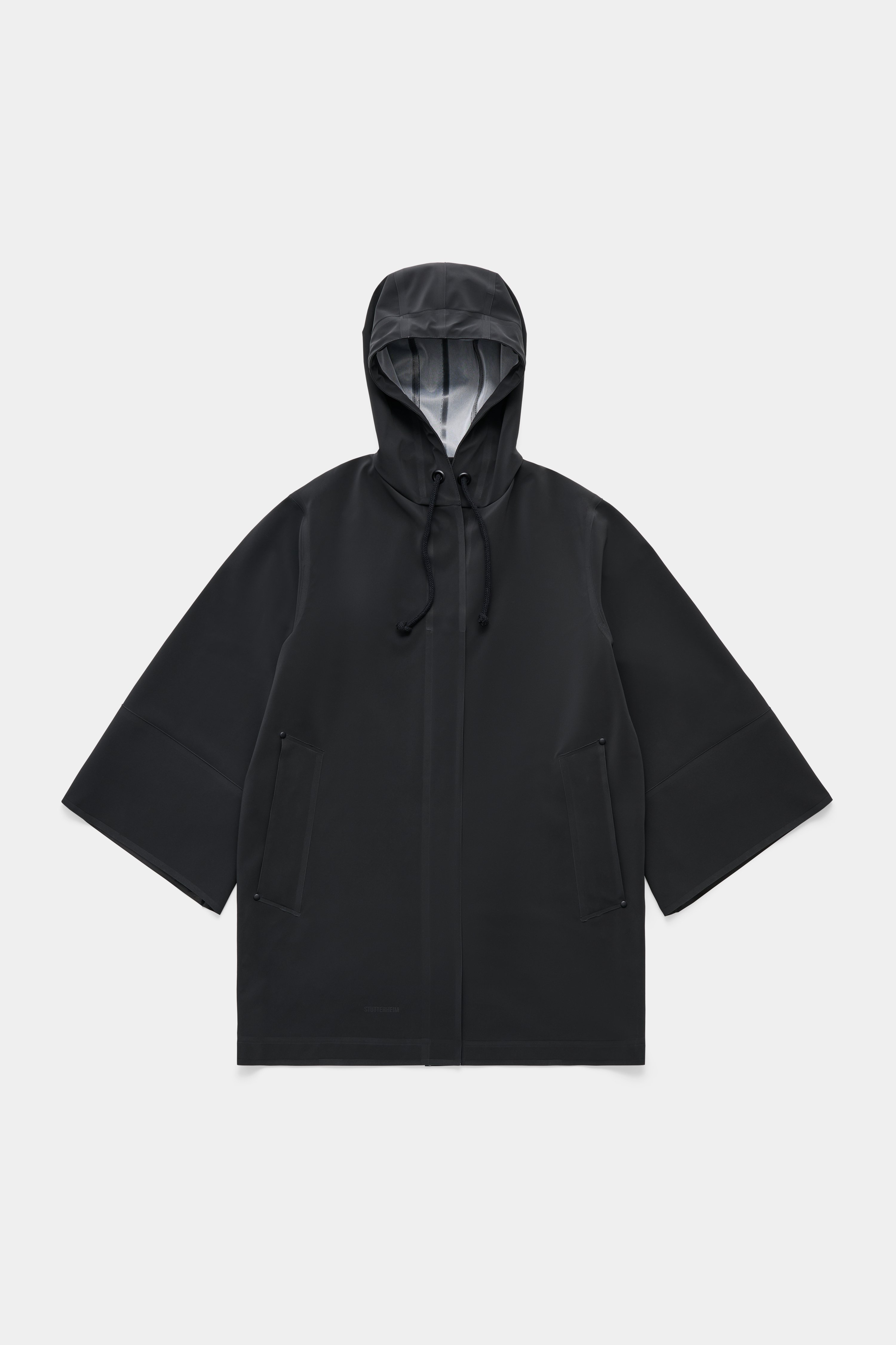 Lubban is a mid-length rain jacket for women in a matte-textured waterproof fabric. Crafted with double-welded seams, it shields the wearer in wet weather. The wide bell sleeves are secured with a knitted wristlet on the inside while the oversized hood is fastened with chunky cotton drawstrings. The comfortable and regular-fit combined with the modern elegant silhouette makes this piece perfect for rainy days in the city.