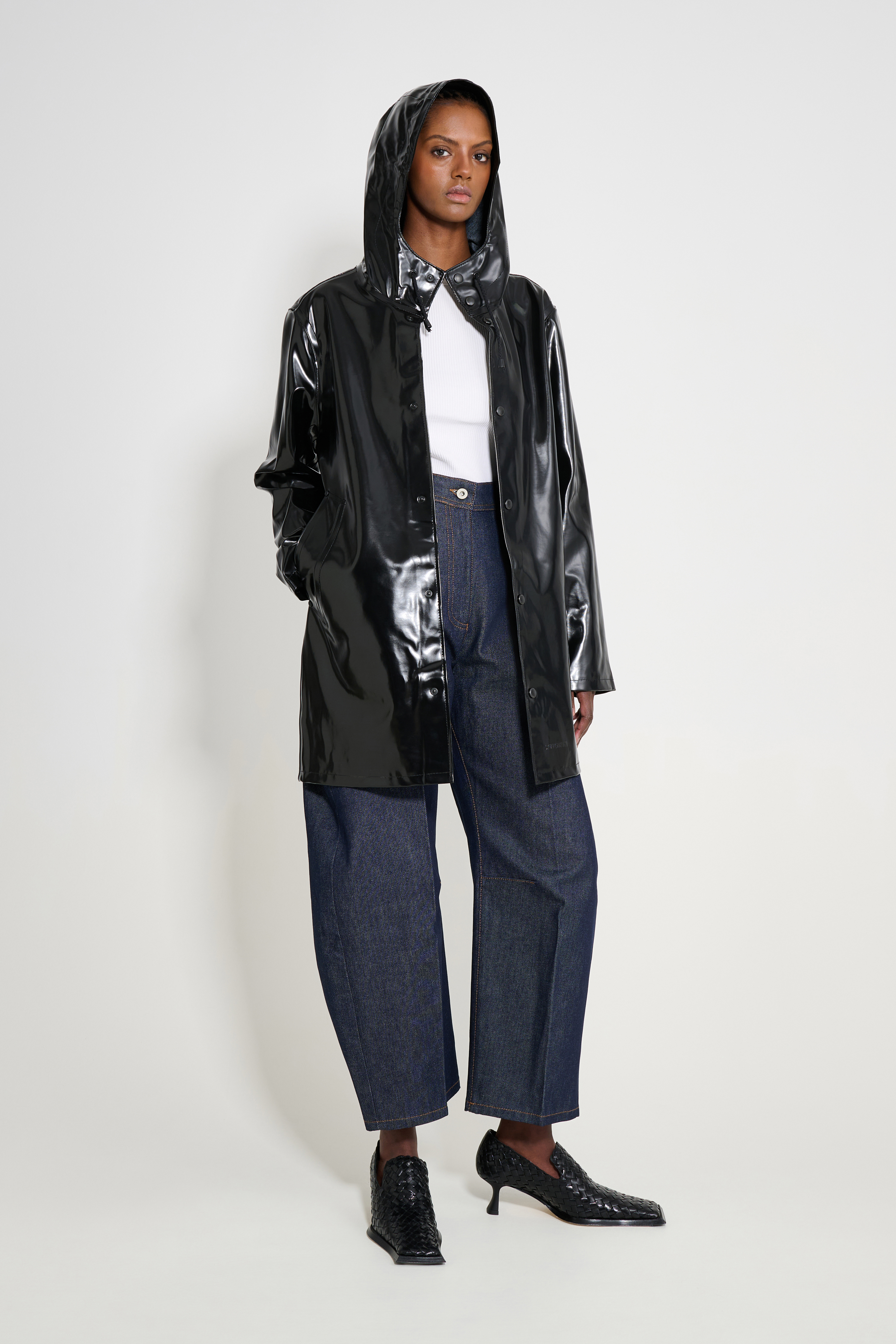 When not in use, we recommend storing your raincoat hanging. Avoid hanging next to garments made of leather or darker denim, to avoid staining from other materials.