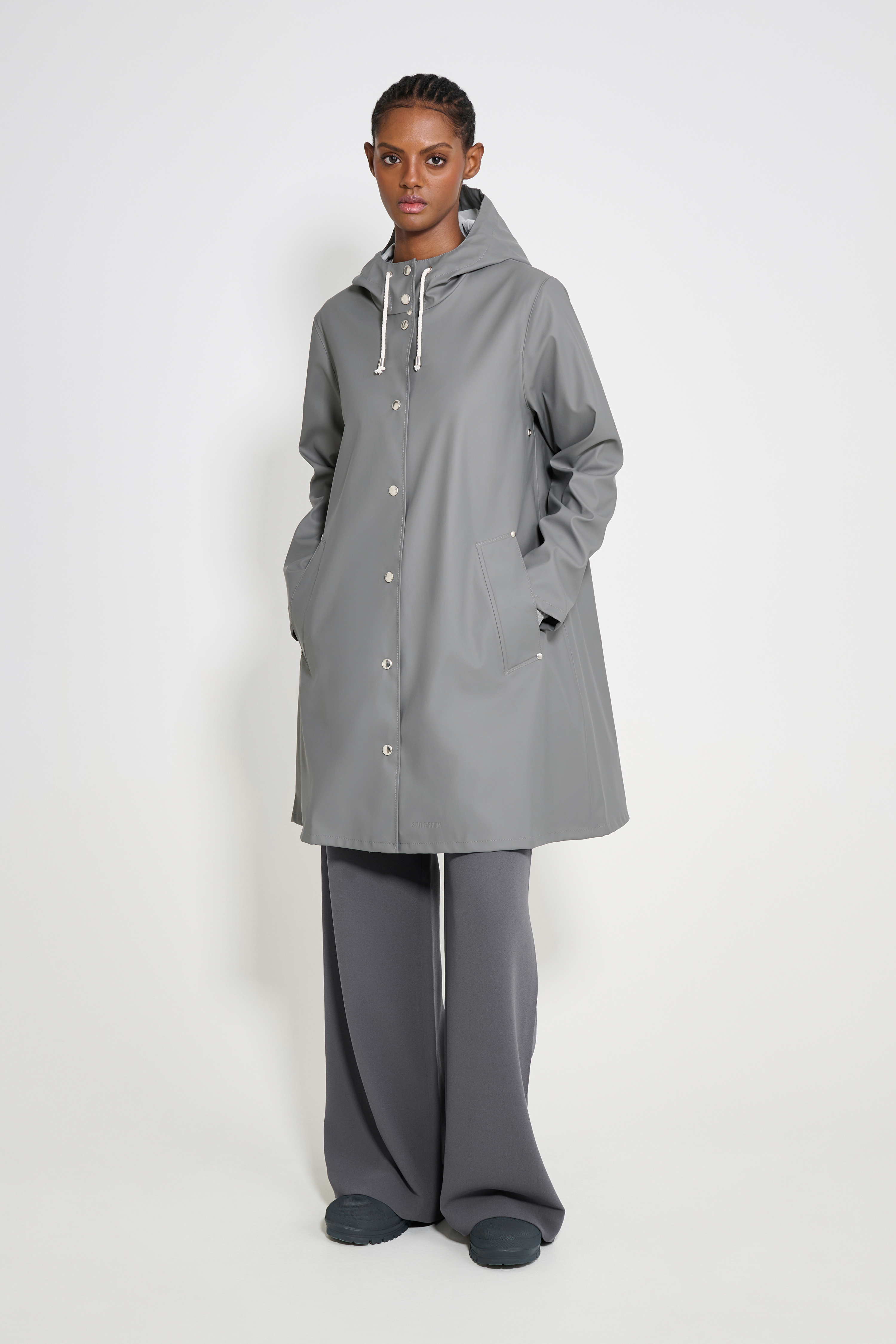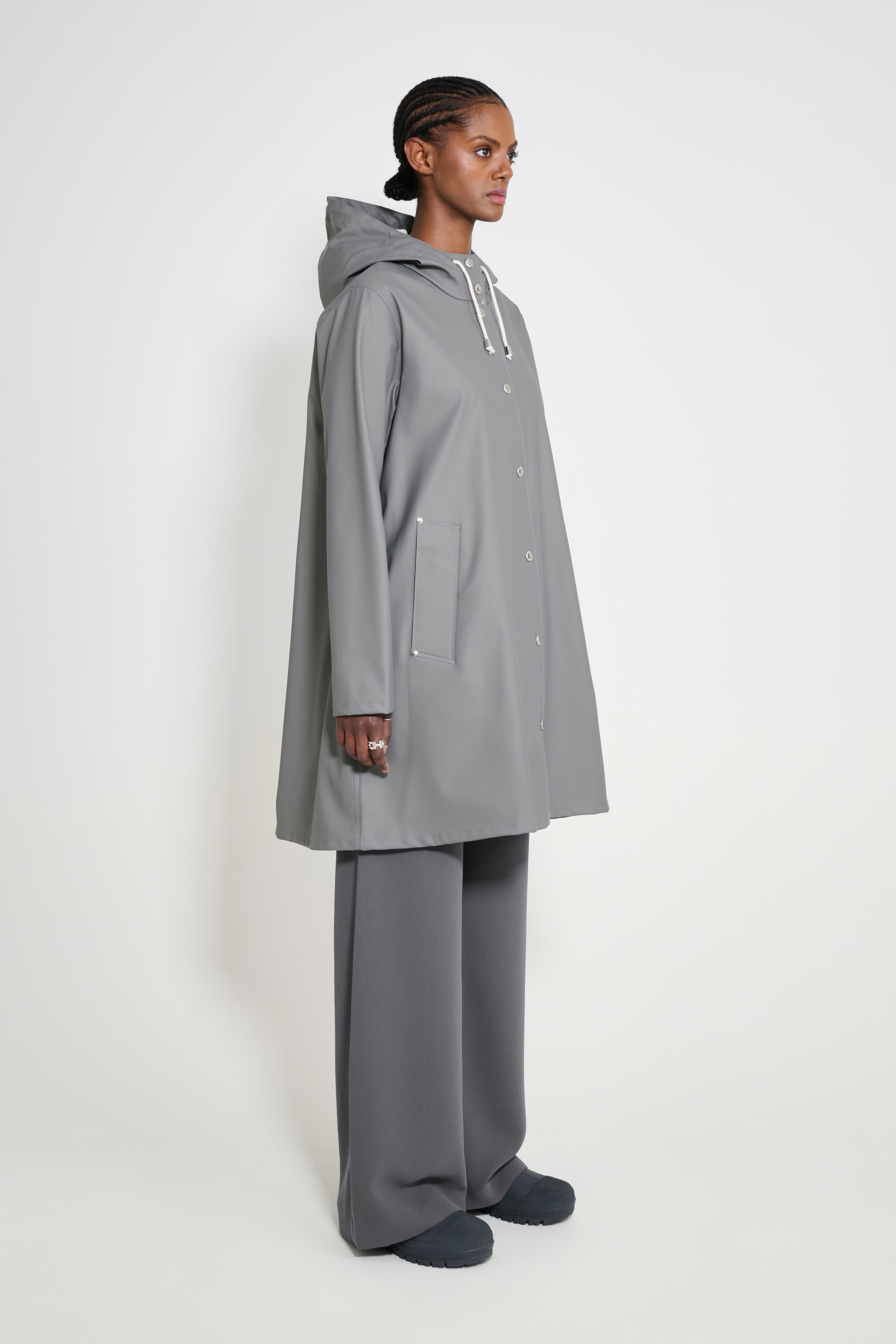 Mosebacke Lightweight is an artisanally made a-line-shaped raincoat for women. The ultra-light waterproof fabric is tailored with double-welded seams, making it impossible for any moisture to seep through. Ease of movement and comfort is achieved with under-arm eyelets and a drawstring hood. The thin and packable fabric makes this garment perfect in unpredictable weather and for travelling.