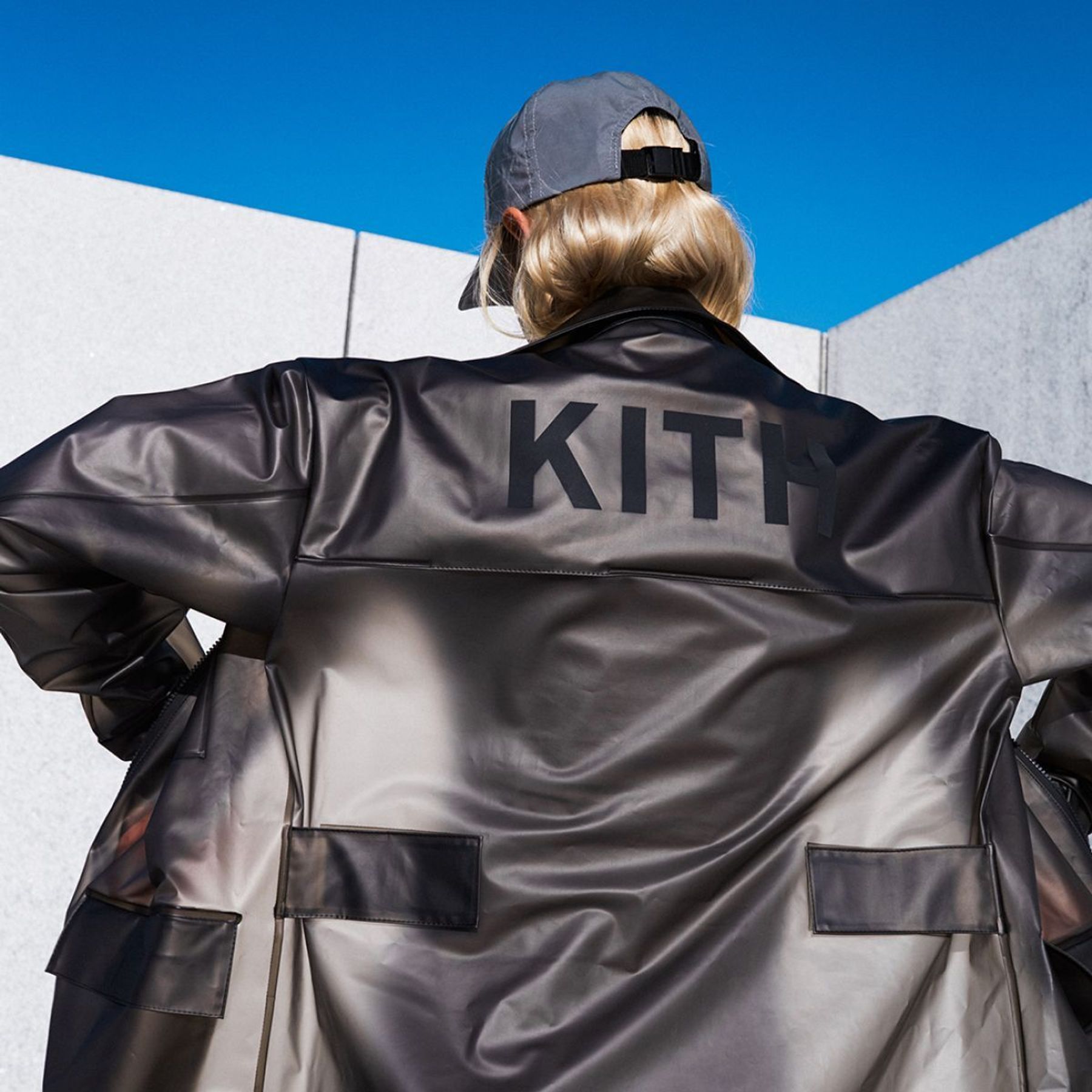 In 2019 Stutterheim teamed up with American lifestyle brand Kith and released two rain jackets for women. Both styles were made in dark grey semi-transparent waterproof fabric and featured a Kith logo back print. The jackets were sold exclusively at Kith shops and through their online store.